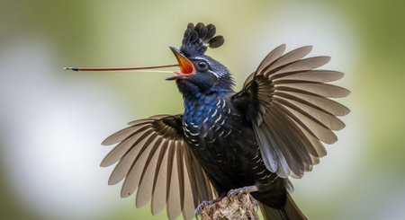 A bird is holding a plastic bag in its beak. The bird is black and orange. Concept of environmental concern, as the plastic bag is a symbol of pollution and waste