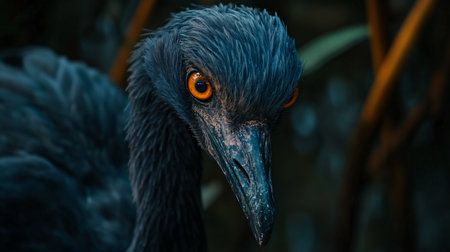 Bird with a blue beak and red eyes. The bird is looking at the camera. The image has a moody and mysterious feel to it