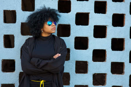 African american woman looking at camera near blurred graffiti outdoors