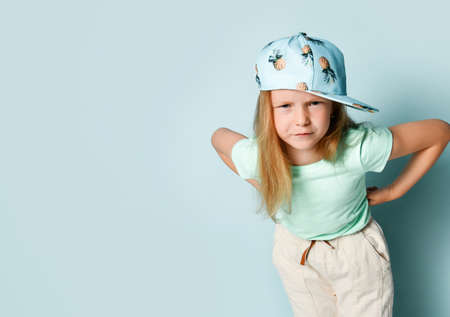 Angry little girl standing with hands on hips, bending her eyebrows and looking angrily. Cropped studio shot isolated on light blue, copy space. Stylish children, emotions, expression, summer time