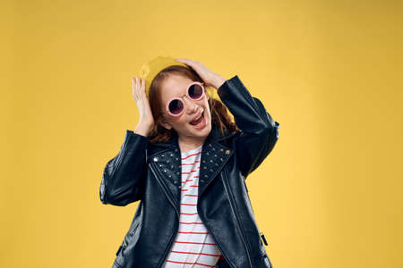 Cheerful little girl in sunglasses and hat lifestyle studio yellow background fashion