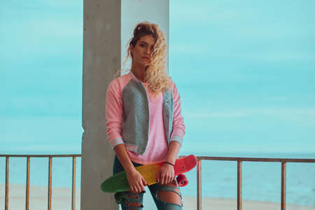 Attractive pensive girl is posing for photographer with skateboard near seaside.
