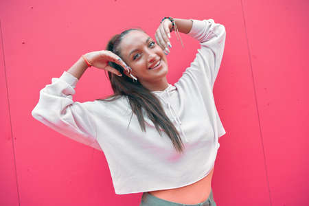 Pretty young friendly girl wearing stylish outfit, earphone, smiling posing on pink background with copy space
