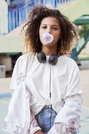 Young woman blowing bubble gum
