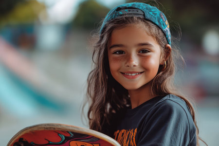 Young girl stands confidently with skateboard in hand, skate park in background, embodying empowerment and individuality.
