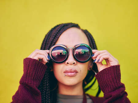 Im cool like that. a young woman wearing sunglasses against a green background.