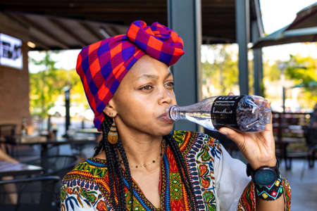 Beautiful african lady wearing a doek or headcover drinking sparkling water
