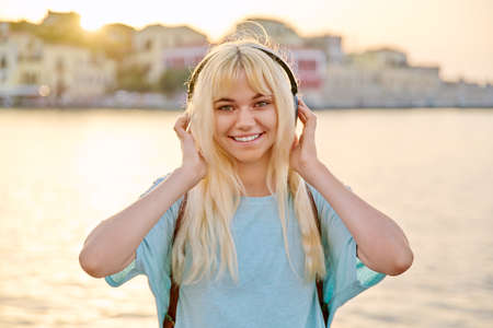Outdoor portrait of happy young blonde woman wearing headphones