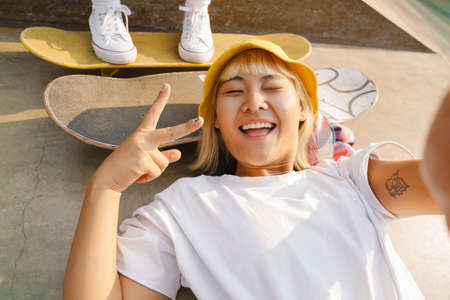 Asian girl gesturing and taking selfie photo while lying on skateboard outdoors