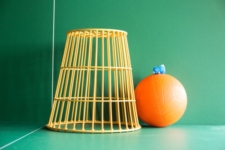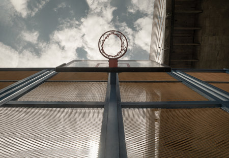 A basketball orange ring at a street sports ground. bottom view. cloudy weather. macro photo. backgroung