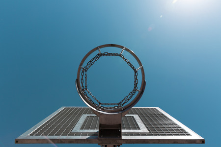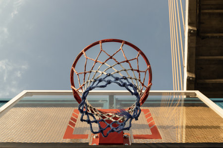basketball hoop with metal net and wooden backboard on blue sky background. Basketball court outdoors. Recreational sport equipment on streetball field alfresco, playground on street. bottom view.