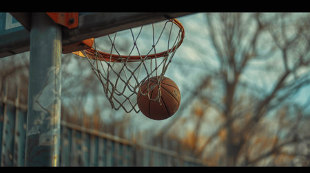A vibrant basketball hoop framed against a soft pastel sky highlights the beauty of outdoor play. This image captures the essence of sports and recreation.