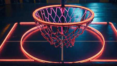 A neon basketball court with a glowing hoop, creating a futuristic sports environment.