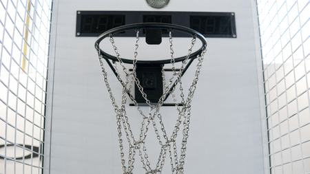 A closeup of a basketball hoop with chain net under the sunlight with a blurry background
