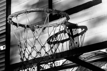 This image captures a vintage basketball hoop with an aged net, showcasing intricate details and rustic charm. Perfect for sports enthusiasts and creative projects.