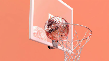 A basketball is passing through a basketball hoop on a vibrant pink background. The sports equipment, ball, mesh, and net create a visually striking image in this creative arts piece
