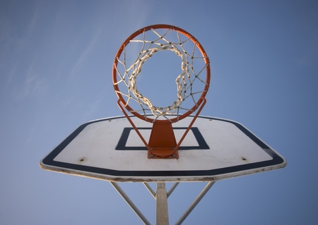Outdoor basketball hoop with blue sky. City basketball court. Low angle. Copy space