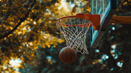 A basketball in mid-air approaches a hoop in a vibrant outdoor setting, capturing the essence of summer sports and athletic enjoyment.