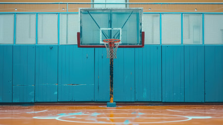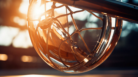 A striking close-up of a basketball hoop and net captures the essence of sports activity. Sunlight streams through a gym window, enhancing the dynamic atmosphere.