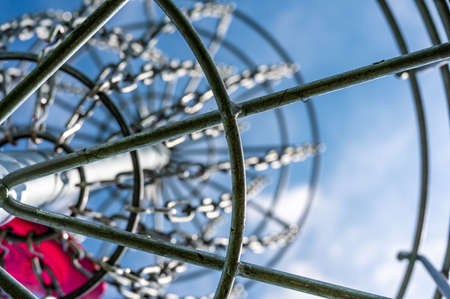 Underneath a disc golf goal looking up with selective focus on the chain basket.