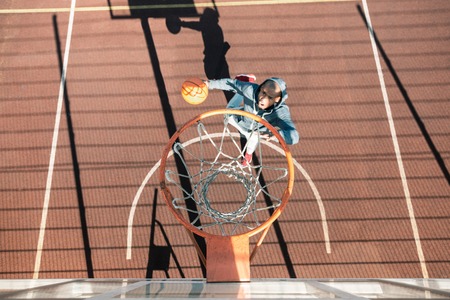 Interesting game. Top view of a nice young man playing basketball while being on the sportsground