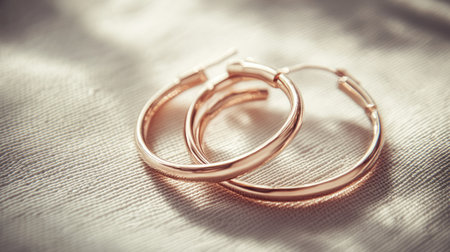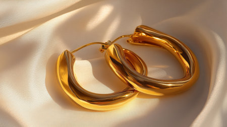 Captivating close-up of elegant gold hoop earrings resting on soft satin fabric. The warm light enhances their beauty, showcasing luxury and style ideal for jewelry photography.