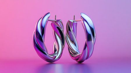 This image features two glossy metal hoop earrings with a reflective surface, set against a gradient pink and purple background, creating a modern and stylish visual.