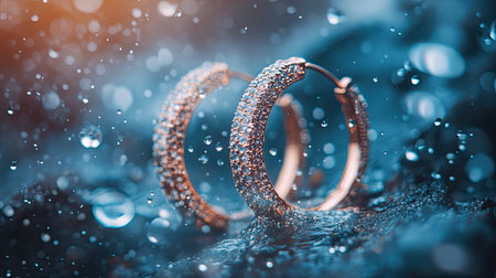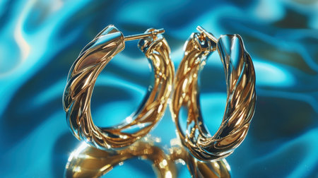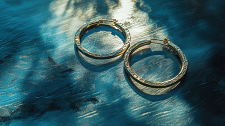 Beautiful gold hoop earrings displayed on a shimmering blue background, highlighting their intricate texture and creating an elegant visual appeal.