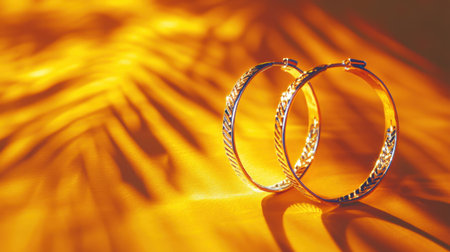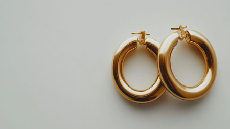 Two gold hoop earrings are displayed on a white surface. The earrings are large and shiny, and they are positioned in a way that they reflect light. Scene is elegant and sophisticated
