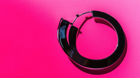 This image showcases an elegant black hoop earring resting on a vibrant pink background, emphasizing its modern design and trendy aesthetic, perfect for fashion enthusiasts.