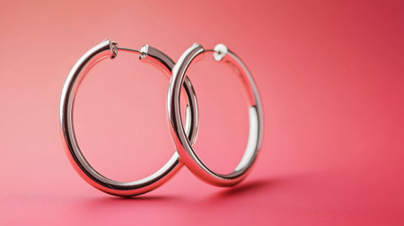 A close-up image of elegant silver hoop earrings gracefully positioned against a soft pink background. The delicate lighting enhances their shine and beauty.