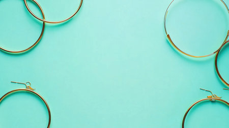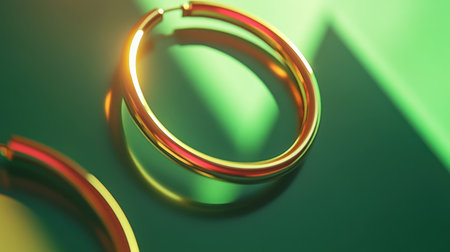A striking image of chic gold hoop earrings resting on a reflective surface, perfect for showcasing modern jewelry design against a vibrant green backdrop.