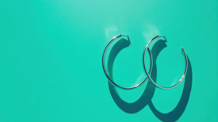 This stunning close-up captures elegant silver hoop earrings casting delicate shadows on a vibrant green background, highlighting contemporary accessory styling.