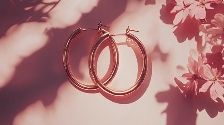 Discover the charm of these elegant rose gold hoop earrings set against a soft pink backdrop, enhanced by delicate floral elements and gentle shadows.