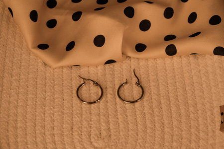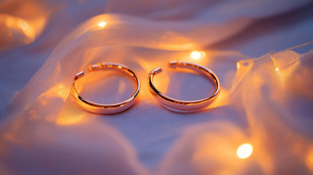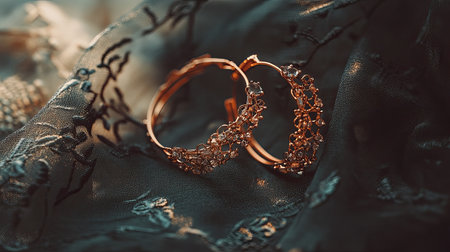 Close-up of elegant rose gold hoop earrings resting on soft fabric, illuminated by warm fairy lights, creating a serene and glamorous atmosphere, perfect for fashion lovers.
