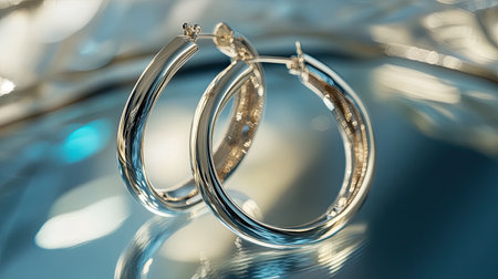 This stunning image showcases elegant silver hoop earrings, capturing their shine on a reflective surface with a soft bokeh background, highlighting their beauty and craftsmanship.