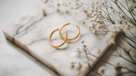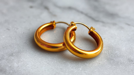 Close-up of gold hoop earrings placed side by side on marble background with soft lighting and space