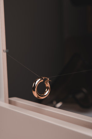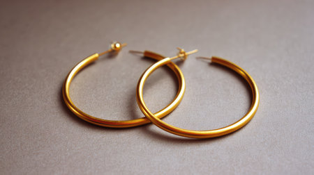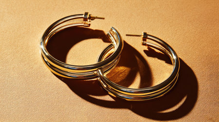 Stunning gold hoop earrings elegantly placed on a soft brown background, capturing light beautifully, perfect for showcasing luxury jewelry in fashion photography.