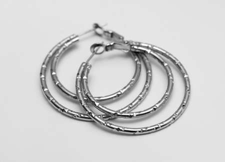 Silver earrings on a white marble background. Black and white photo.