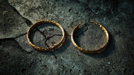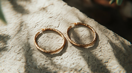 Beautiful golden hoop earrings displayed on a rustic textured surface, highlighting their craftsmanship and style, perfect for fashion enthusiasts and jewelry lovers.