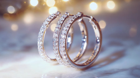 A pair of sparkling diamond hoop earrings placed on a marble surface, showcasing the intricate design and brilliant sparkle of the diamonds