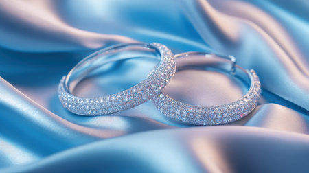 Stunning hoop earrings embellished with sparkling stones, elegantly placed on soft blue silk fabric, ideal for showcasing jewelry in fashion and beauty contexts.