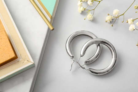 Beautiful earrings on light background