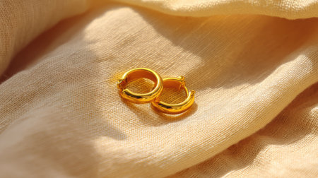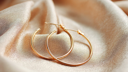 Stunning close-up of gold hoop earrings resting on soft satin fabric, creating an elegant and warm ambience perfect for showcasing fine jewelry and fashion accessories.