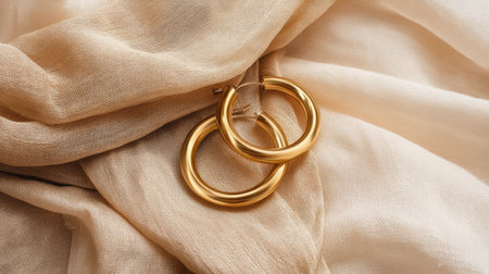Golden hoop earrings lay elegantly on a smooth, soft fabric backdrop. Their shiny surface reflects light beautifully, showcasing their sleek design. Perfect for any occasion.
