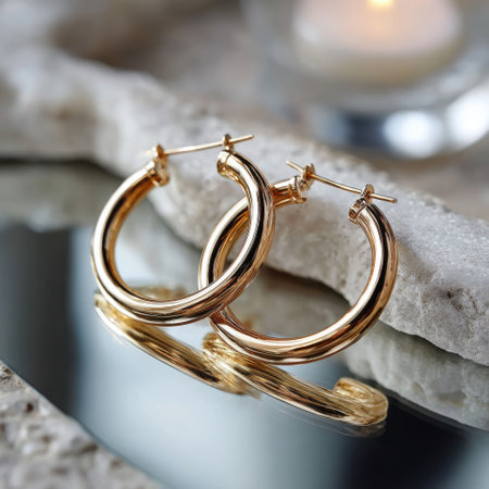 This image showcases elegant gold hoop earrings on a reflective surface, exuding modern aesthetics and luxury. The blurred background enhances their beauty.