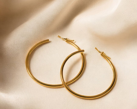 A beautiful display of elegant gold hoop earrings resting on a soft satin fabric. The smooth texture and gentle lighting enhance their timeless beauty.