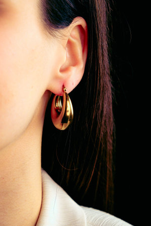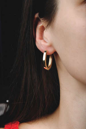 Stylish ear adorned with chic, minimalist hoop earrings, focusing on their fashionable design and understated elegance