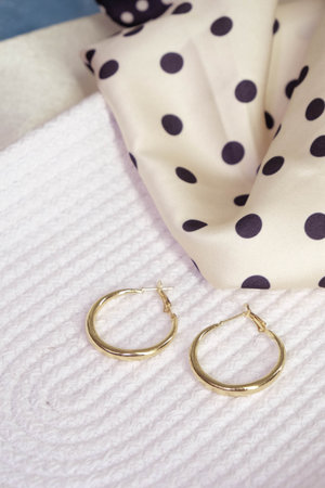 A pair of elegant gold hoop earrings rests on soft fabric, showcasing their luxurious shine. Ideal for fashion lovers seeking stylish accessories.