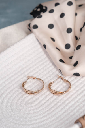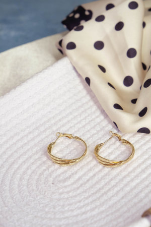 Close-up view of elegant golden earrings resting on soft beige fabric, showcasing a sophisticated accessory that adds a touch of luxury to any outfit.